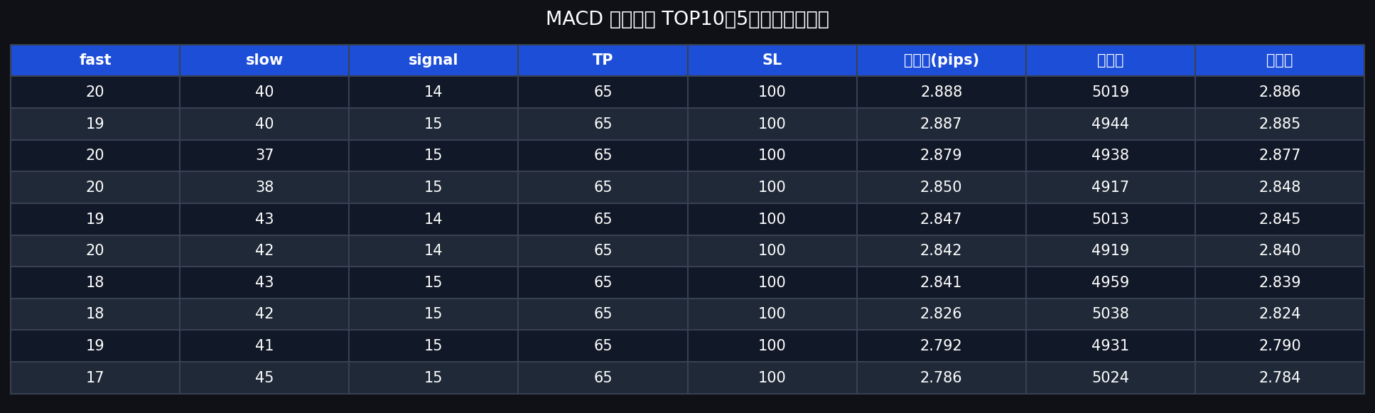 MACDパラメータ : 短期EMA 5〜20、長期EMA 20〜50、シグナル 5〜15(計2,178,000通り)