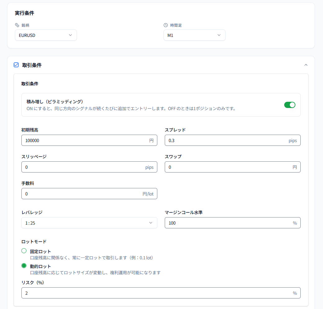 - 動的ロット:口座残高の2%リスク