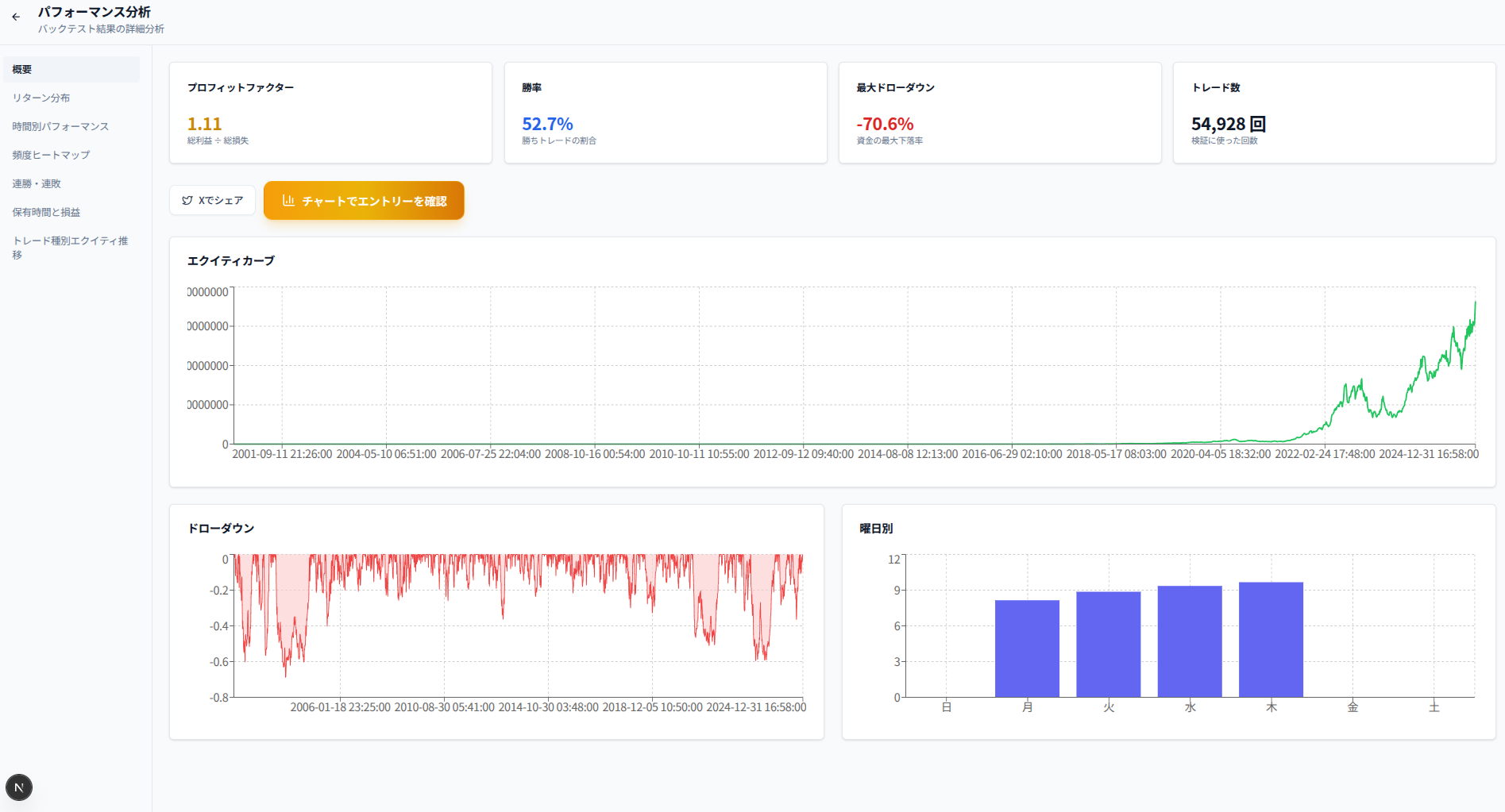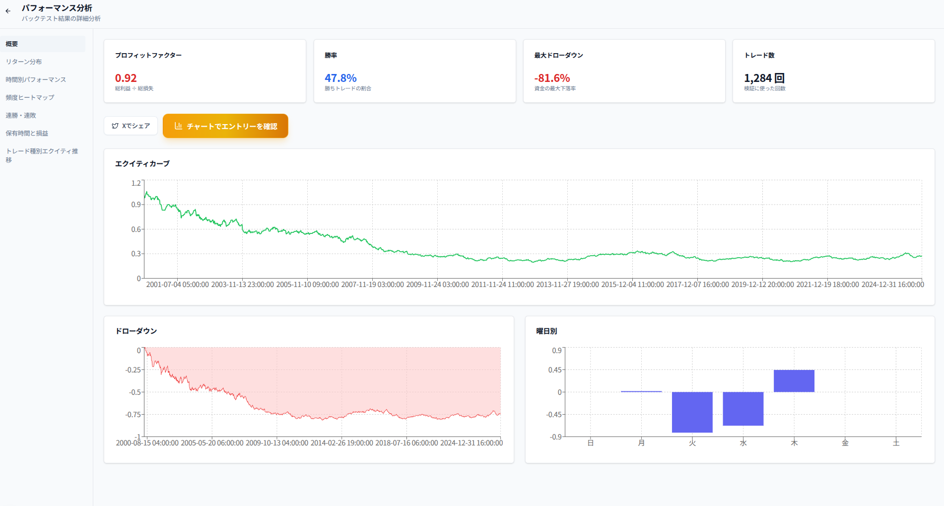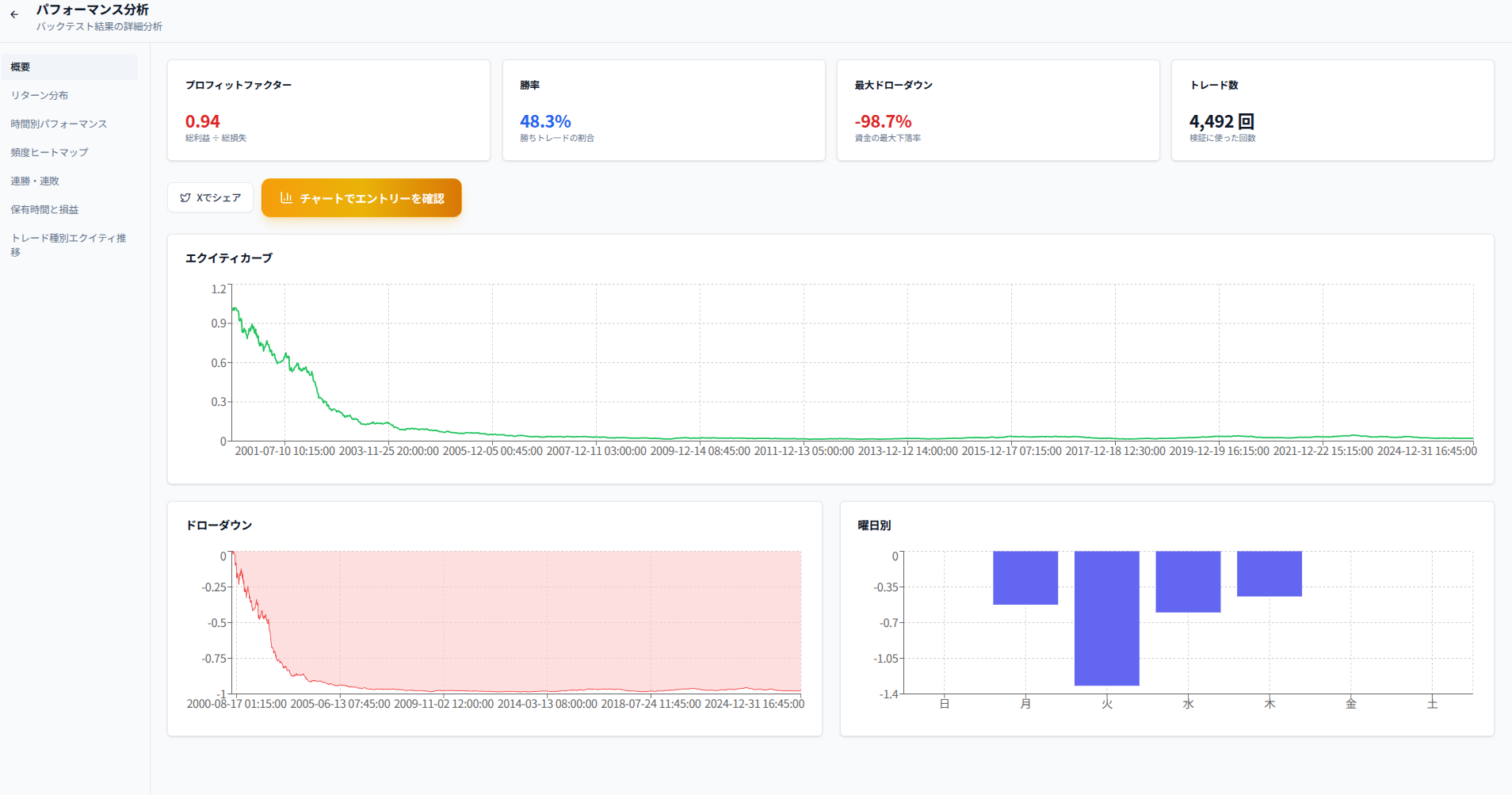 スキャルピングと同様に「勝てない構造」を持ちやすい手法のバックテスト結果はこちらで確認できる。